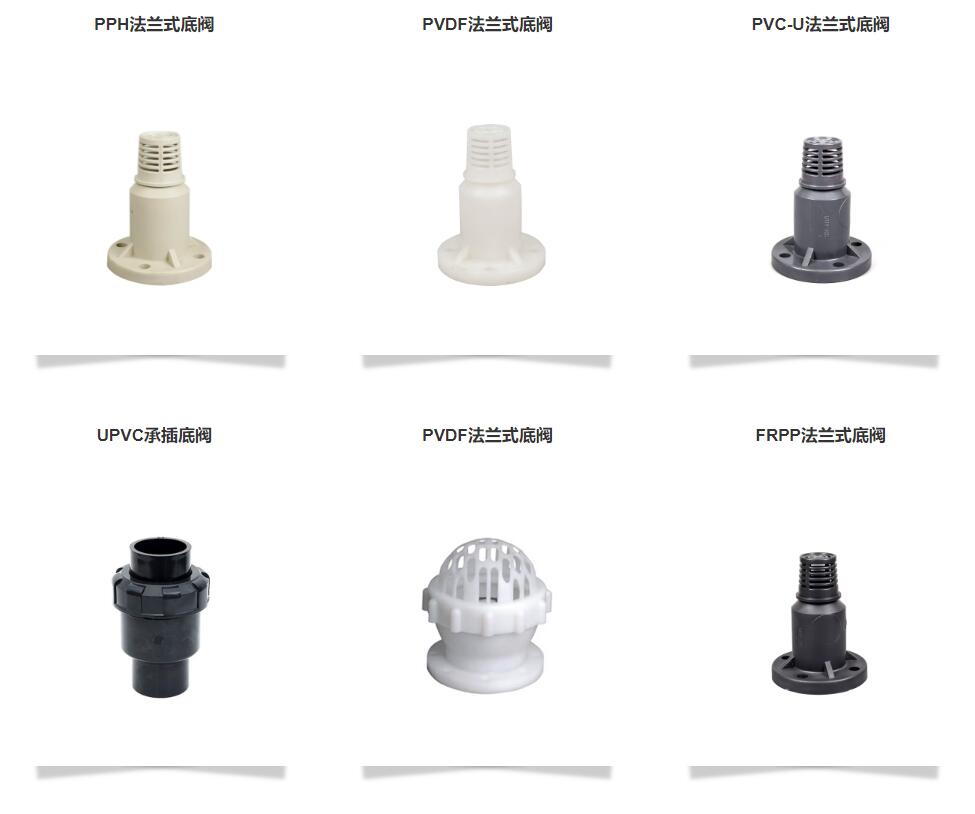 聚丙烯( PP ),玻璃纤维增强聚丙烯( FRPP ),均聚聚丙烯(PPH), 聚偏二氟乙烯(PVDF),聚氯乙烯(PVC - U)底阀