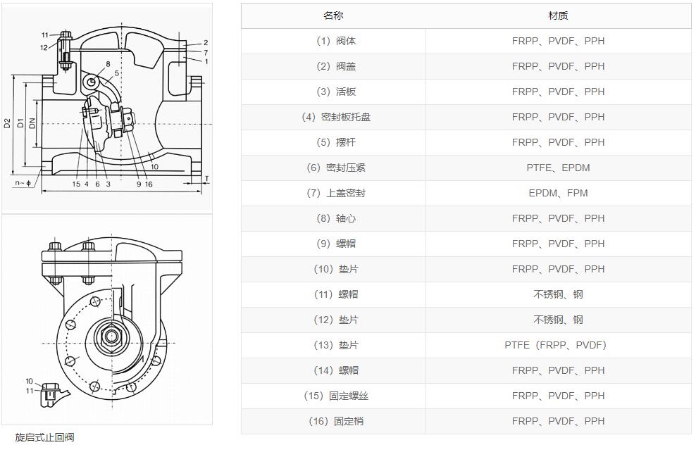 聚丙烯( PP ),玻璃纤维增强聚丙烯( FRPP ),均聚聚丙烯(PPH), 聚偏二氟乙烯(PVDF),聚氯乙烯(PVC - U)旋启式止回阀