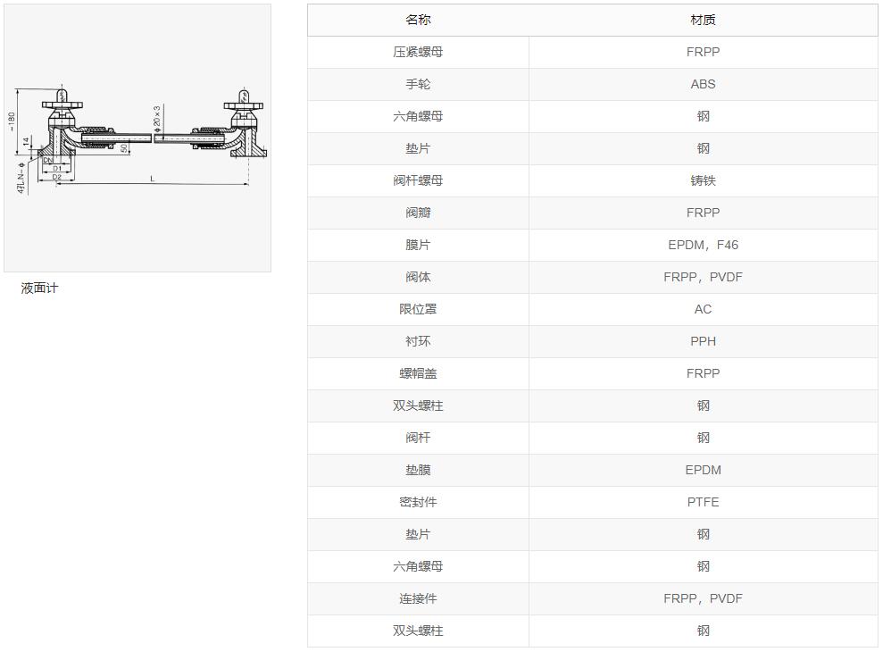 聚丙烯( PP ),玻璃纤维增强聚丙烯( FRPP ),均聚聚丙烯(PPH), 聚偏二氟乙烯(PVDF),聚氯乙烯(PVC - U) 液面计