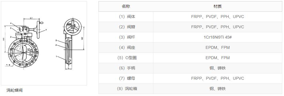 聚丙烯( PP ),玻璃纤维增强聚丙烯( FRPP ),均聚聚丙烯(PPH), 聚偏二氟乙烯(PVDF),聚氯乙烯(PVC - U)涡轮蝶阀